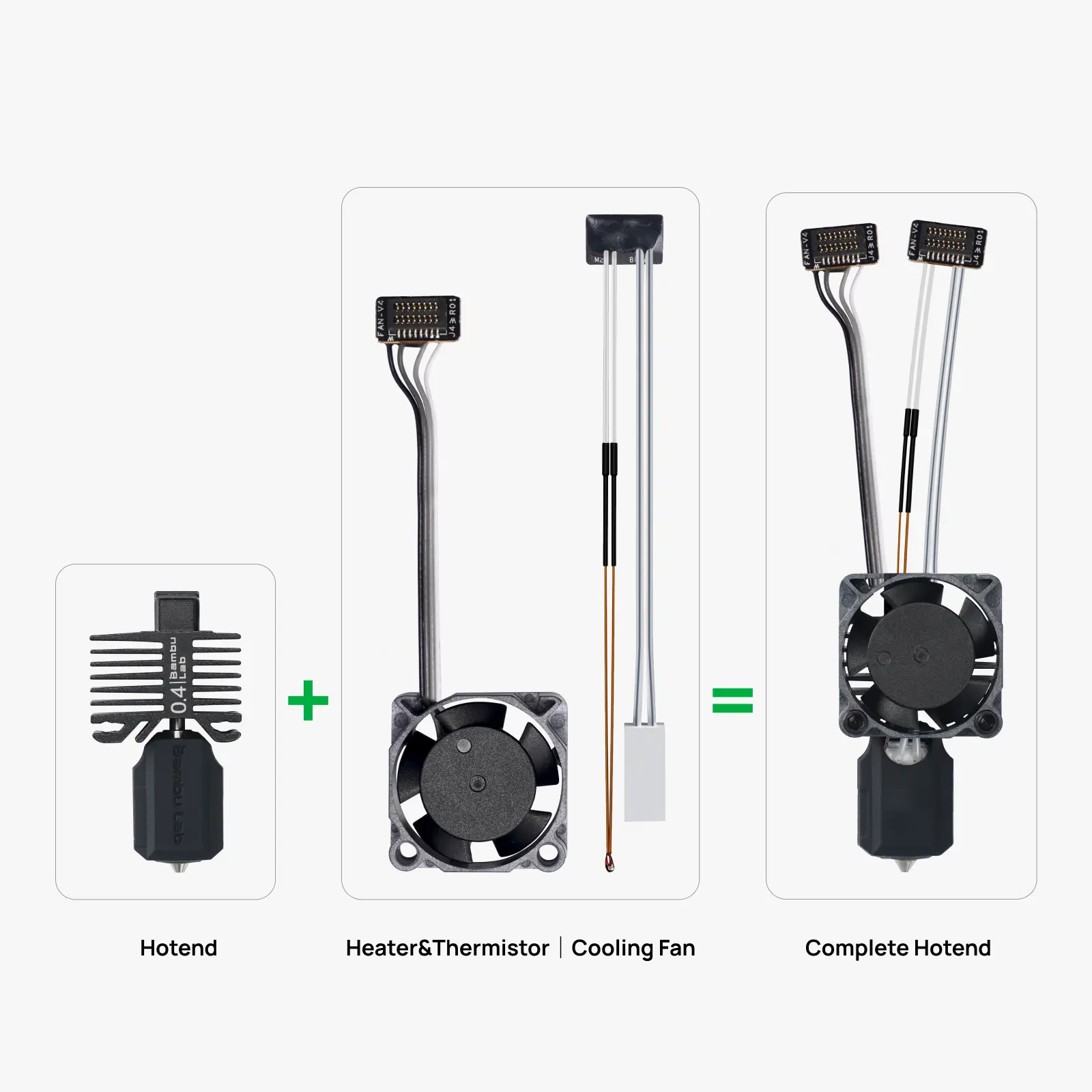 Wenn Sie Ihre Düse austauschen müssen, können Sie entweder das Hotend mit der Düse an Ihrer ursprünglichen kompletten Hotend-Baugruppe ersetzen oder die gesamte Vollständige Hotend Baugruppe austauschen. Deshalb bietet Bambu Lab Hotends in zwei Konfigurationen an: als ein einzelnes Hotend mit Düse oder als eine vollständige Hotend Baugruppe.