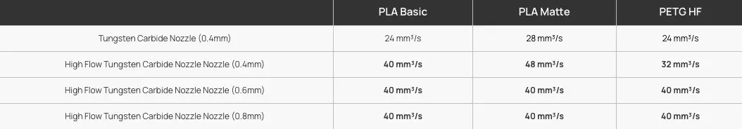 | Filament | 0.4 mm High Flow Tungsten Carbide Nozzle | 0.6 mm High Flow Tungsten Carbide Nozzle | 0.8 mm High Flow Tungsten Carbide Nozzle |