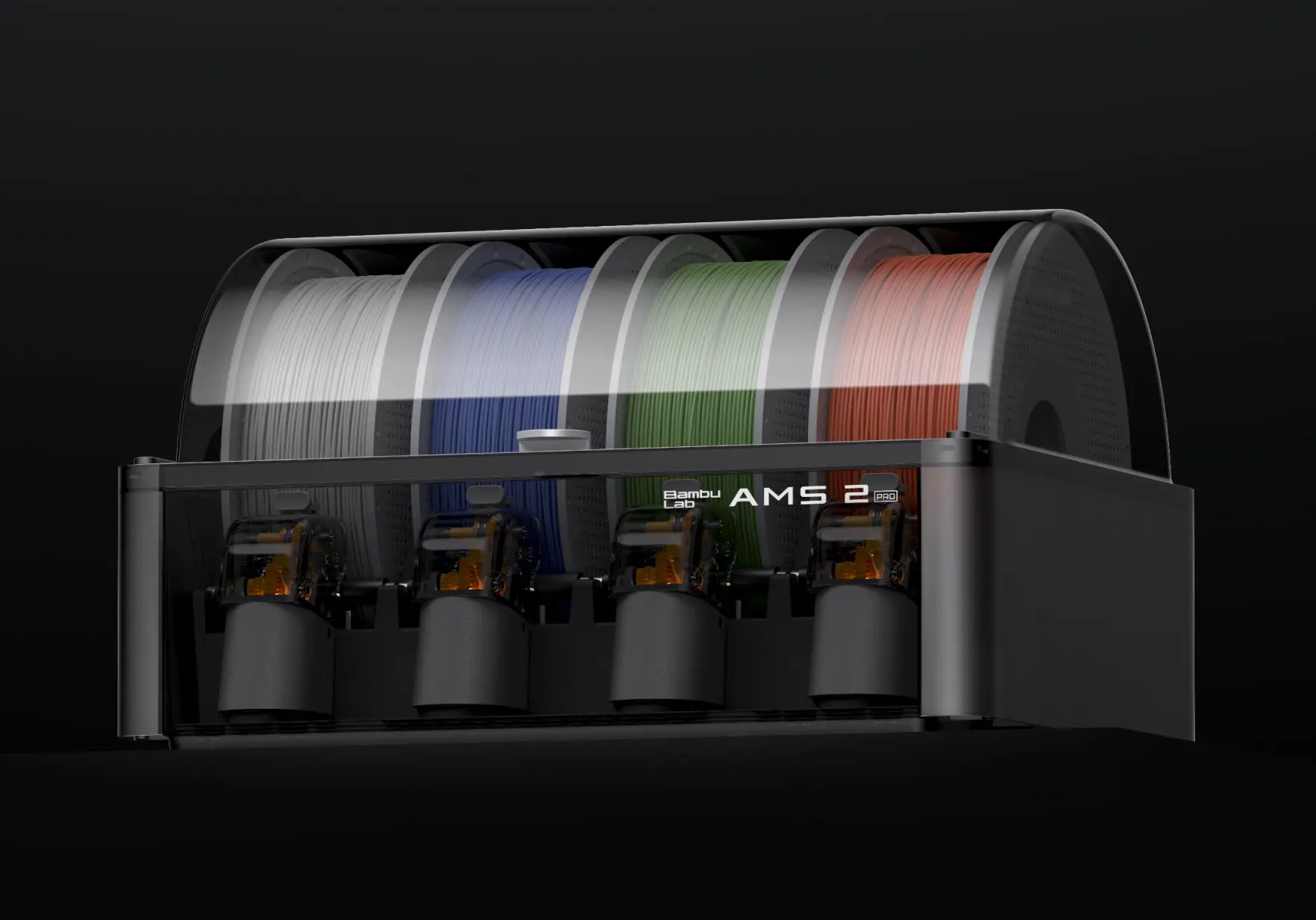 Das AMS 2 Pro ist das neueste Materialwechselsystem von Bambu Lab und wurde speziell für den zuverlässigen Multimaterial- und Mehrfarbendruck entwickelt. Es bietet Platz für bis zu vier Filamentrollen und kann mit bis zu vier Einheiten gleichzeitig kombiniert werden - insgesamt 16 Rollen in einem Druckjob.