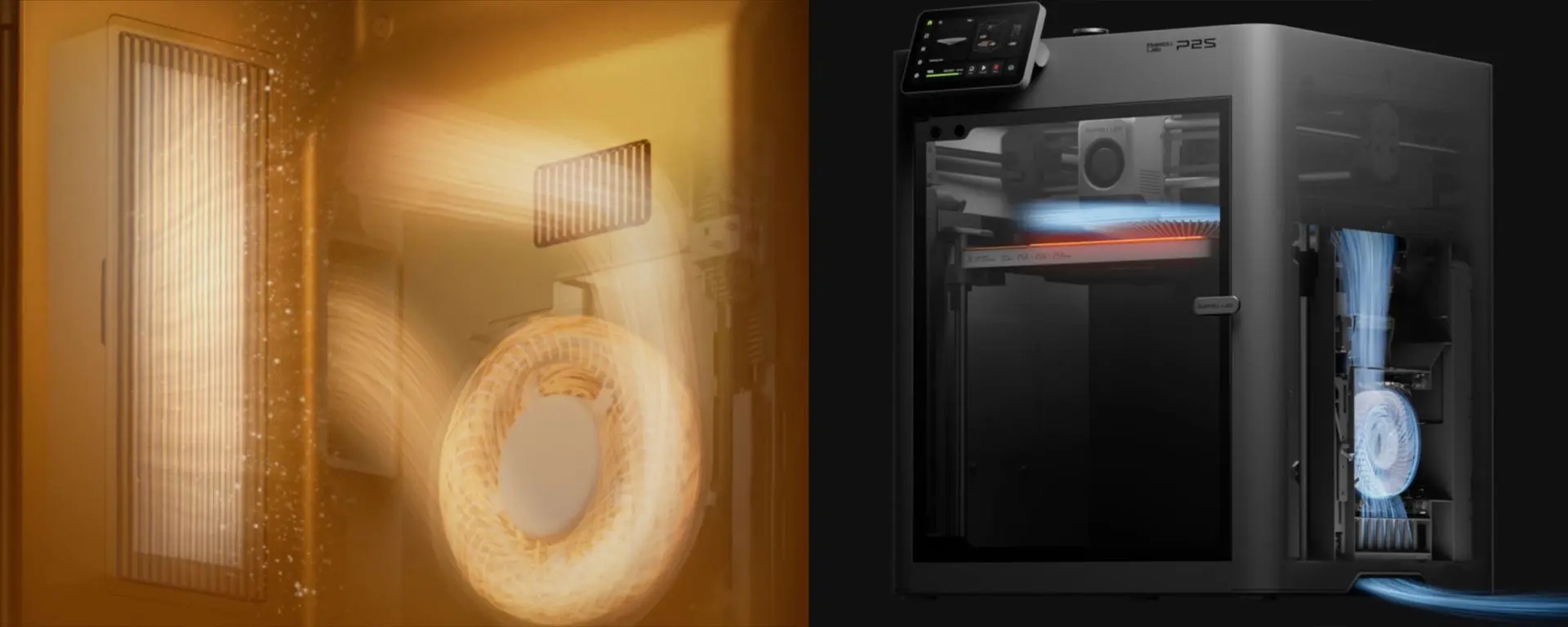 Der Innenraumlüfter sorgt für eine konstante Temperatur im Bauraum und leitet die Abluft über einen Aktivkohlefilter, der Partikel und Gerüche effektiv reduziert. So bleibt die Luft selbst beim Drucken mit Materialien wie ABS sauber und frei von störenden Emissionen.