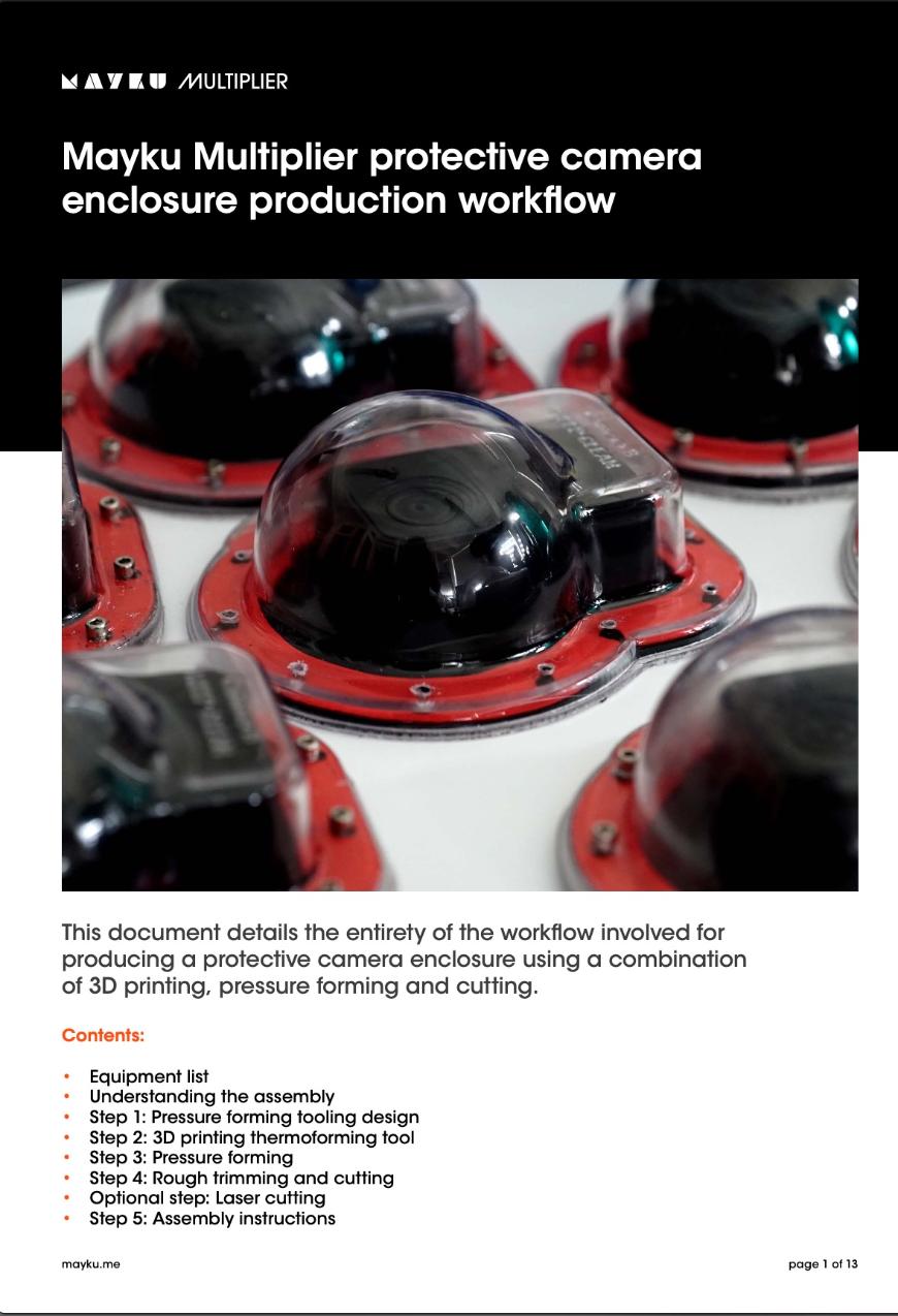Das Whitepaper bietet eine umfassende Anleitung zur Fertigung eines Schutzgehäuses für Kameras mit der Mayku Multiplier. Der Workflow kombiniert innovative Techniken wie 3D-Druck, Druckumformung (Pressure Forming) und präzise Schneideverfahren.