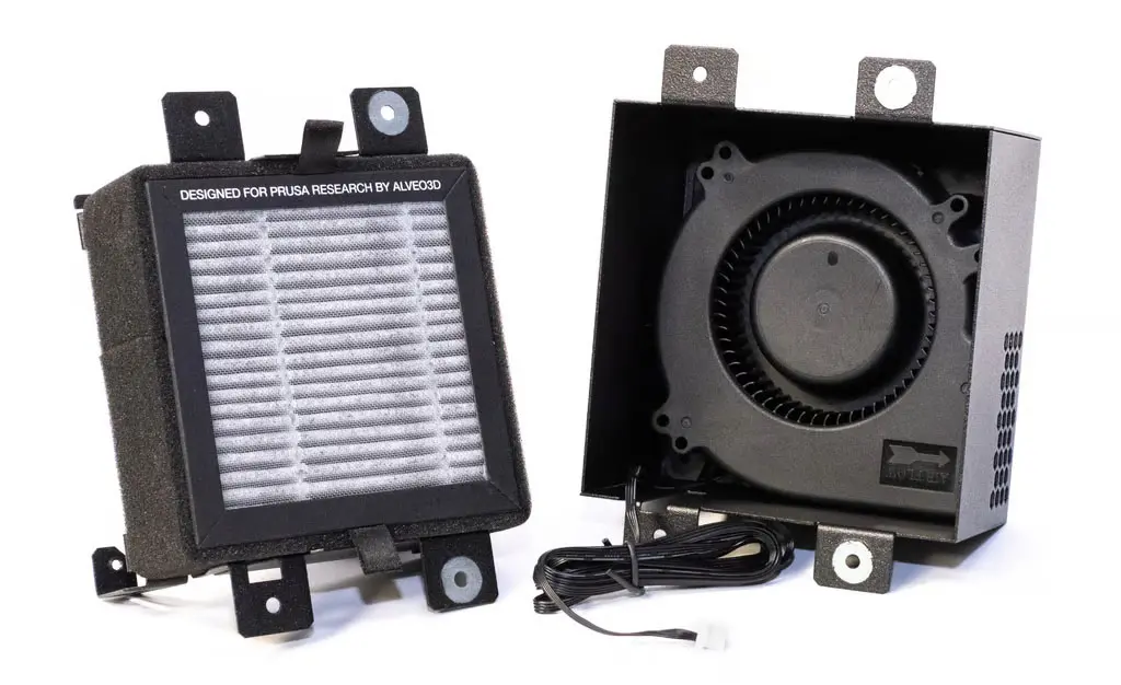 Das Advanced Filtration System ist ein Set, das ein Gehäuse mit einem HEPA-Filter, einem Kohlefilter und einem Hochdruckgebläse enthält, das auf der Rückseite des Prusa CORE One installiert werden kann und sich vollständig in den Drucker integrieren lässt.